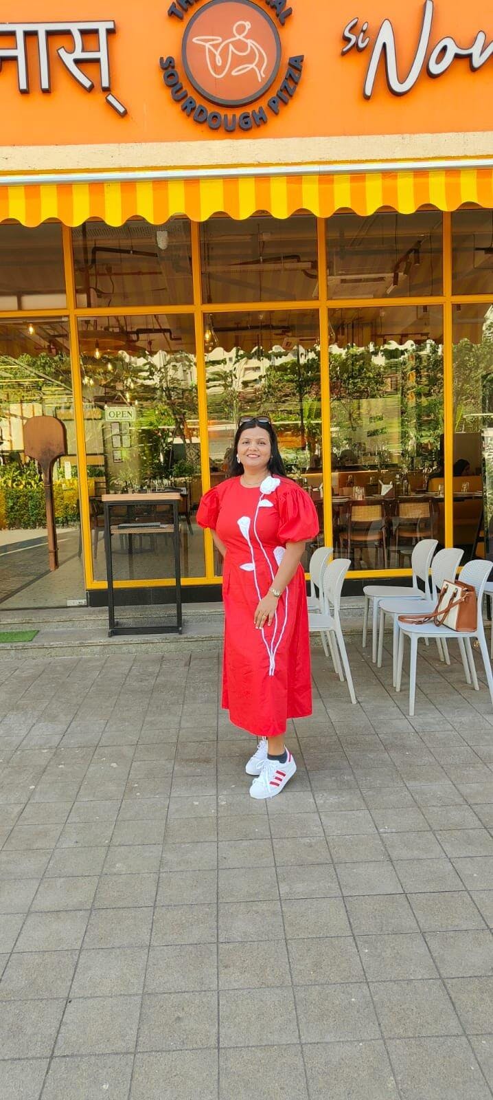 "- Unique Red dress adorned with stunning handcrafted white flower appliqués